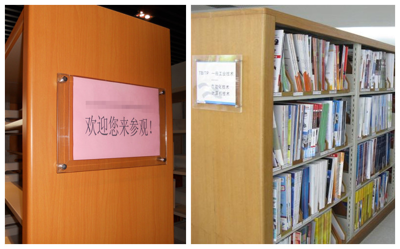 书架标签是大学图书馆的标志特征之一,位于每个书架侧面,通过特定的文字、图案标识出该架图书的分类类名、分类号等信息,是对书架上图书信息的一种标示。