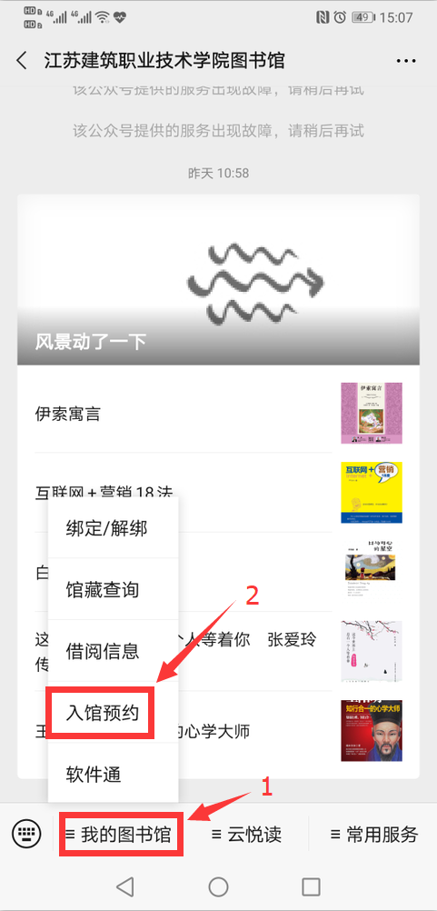 第二步、进入图书馆微信公众号,左下角“我的图书馆” -> 选择“入馆预约”;或进入校园企业微信号,选择条目列表最后一条“图书馆入馆预约”功能。