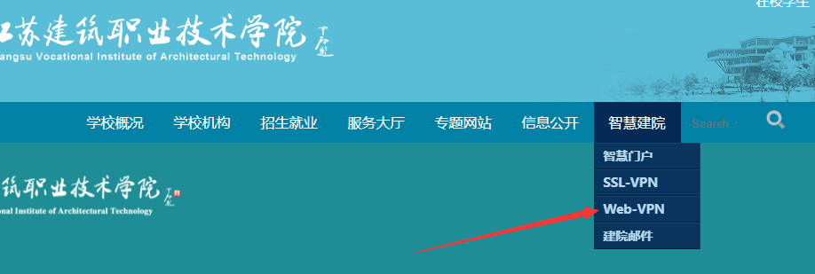第一步,登录HJC黄金城网站,选择上部导航栏最右侧“智慧建院”中的“Web-VPN”;