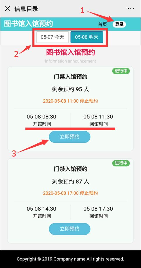 第三步、点击右上角“登录”,输入学号(学生)/工号(教师),密码默认为000,登录后选择预约日期及预约入馆的时间段,点击“立即预约”;